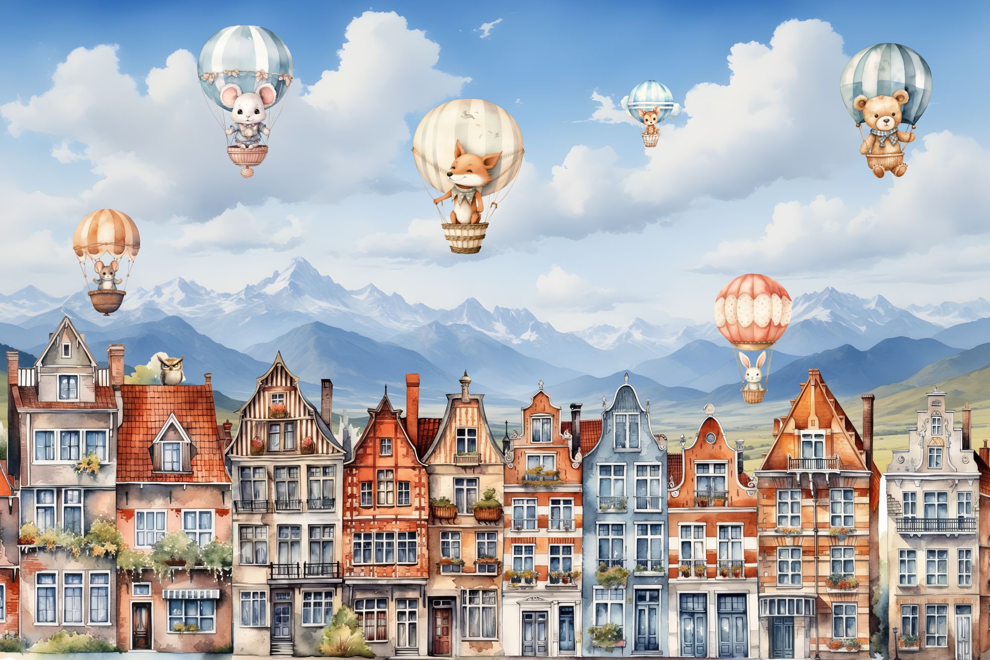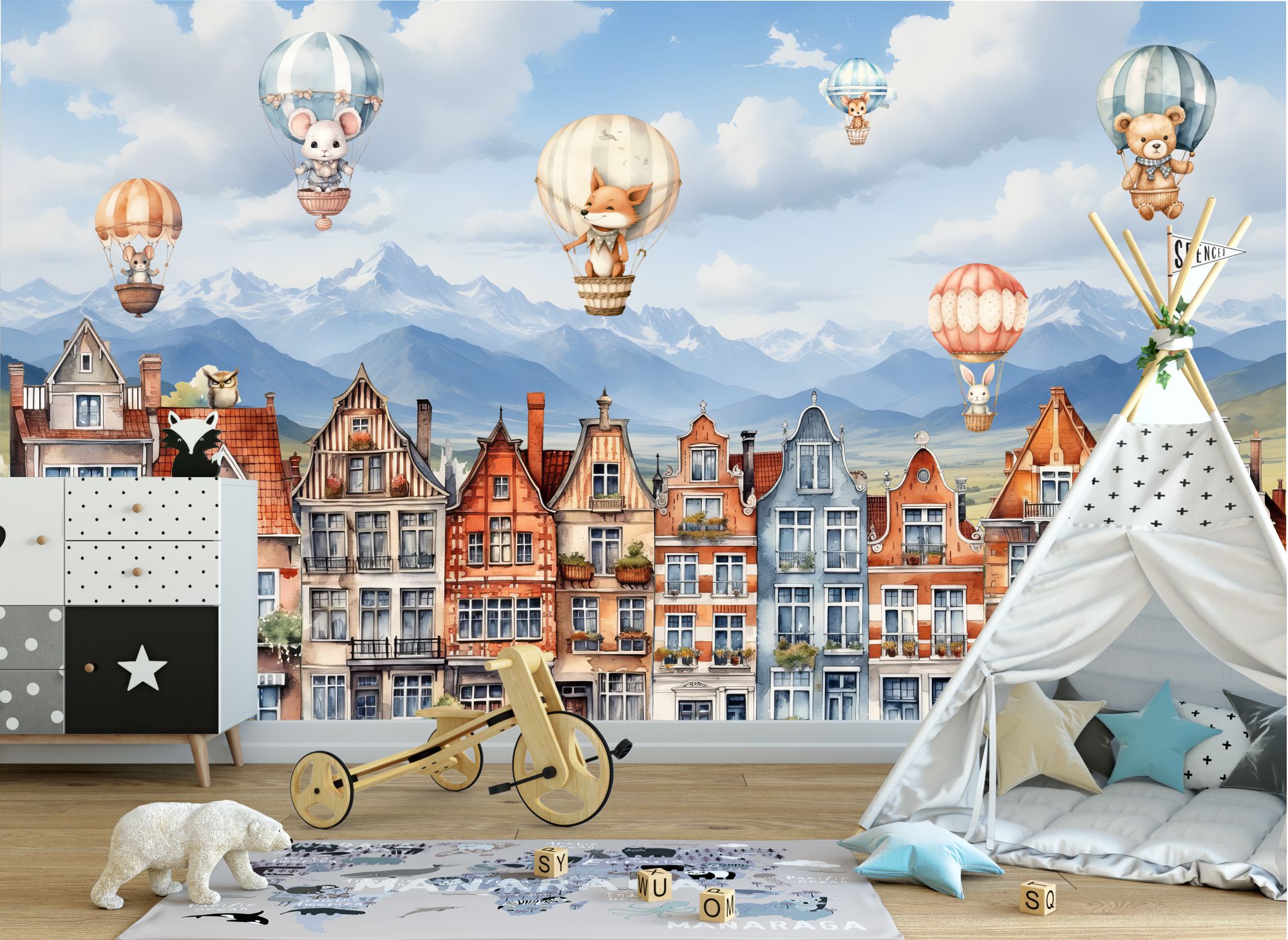 Fototapeta dla dzieci balony ze zwierzętami nad domkami to doskonały sposób, aby stworzyć w pokoju dziecka przytulną i inspirującą przestrzeń. Motywy unoszących się balonów i samolotów symbolizują marzenia, przygodę i beztroskę – wszystko to, czego potrzebuje każdy mały odkrywca.