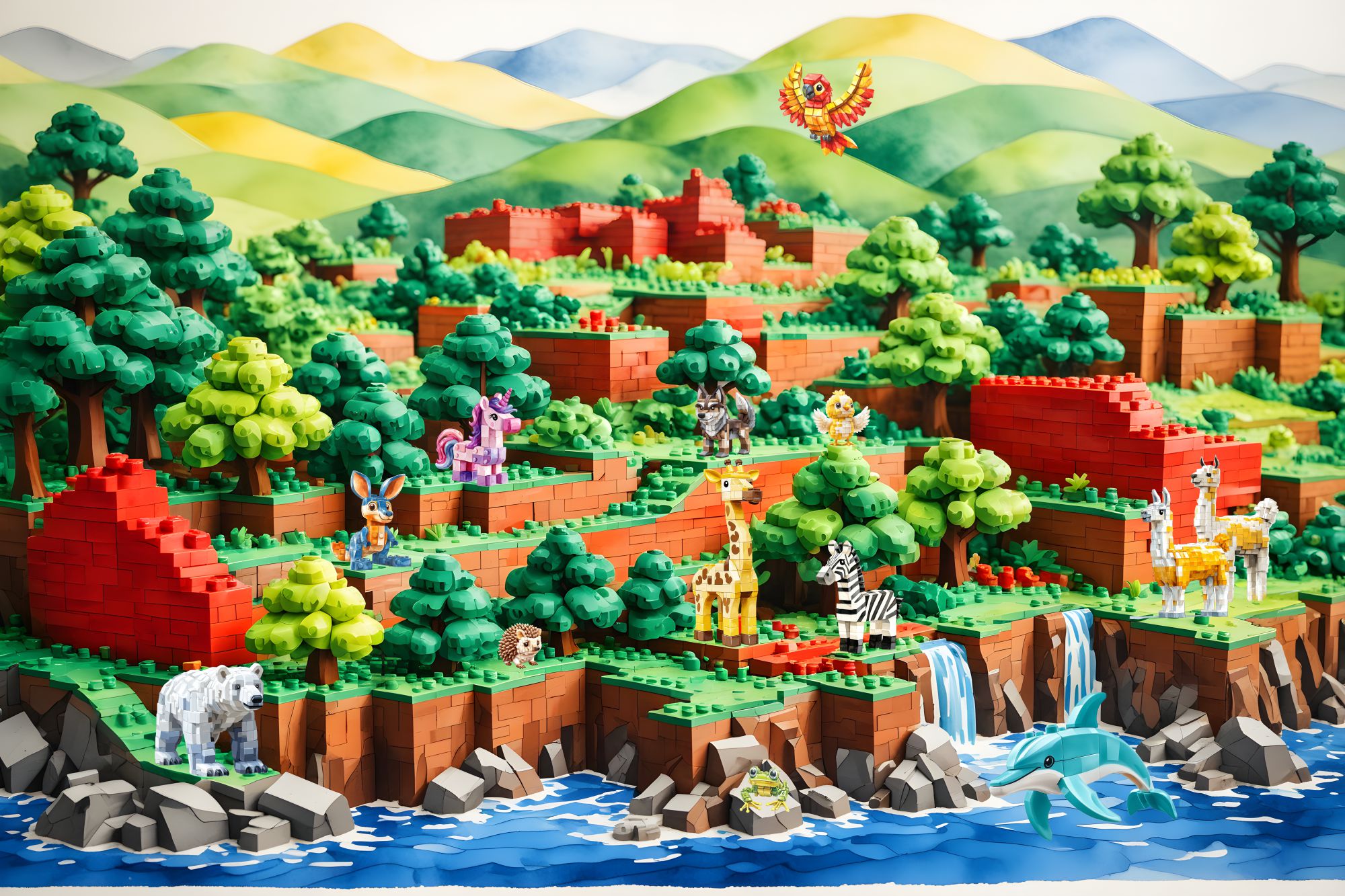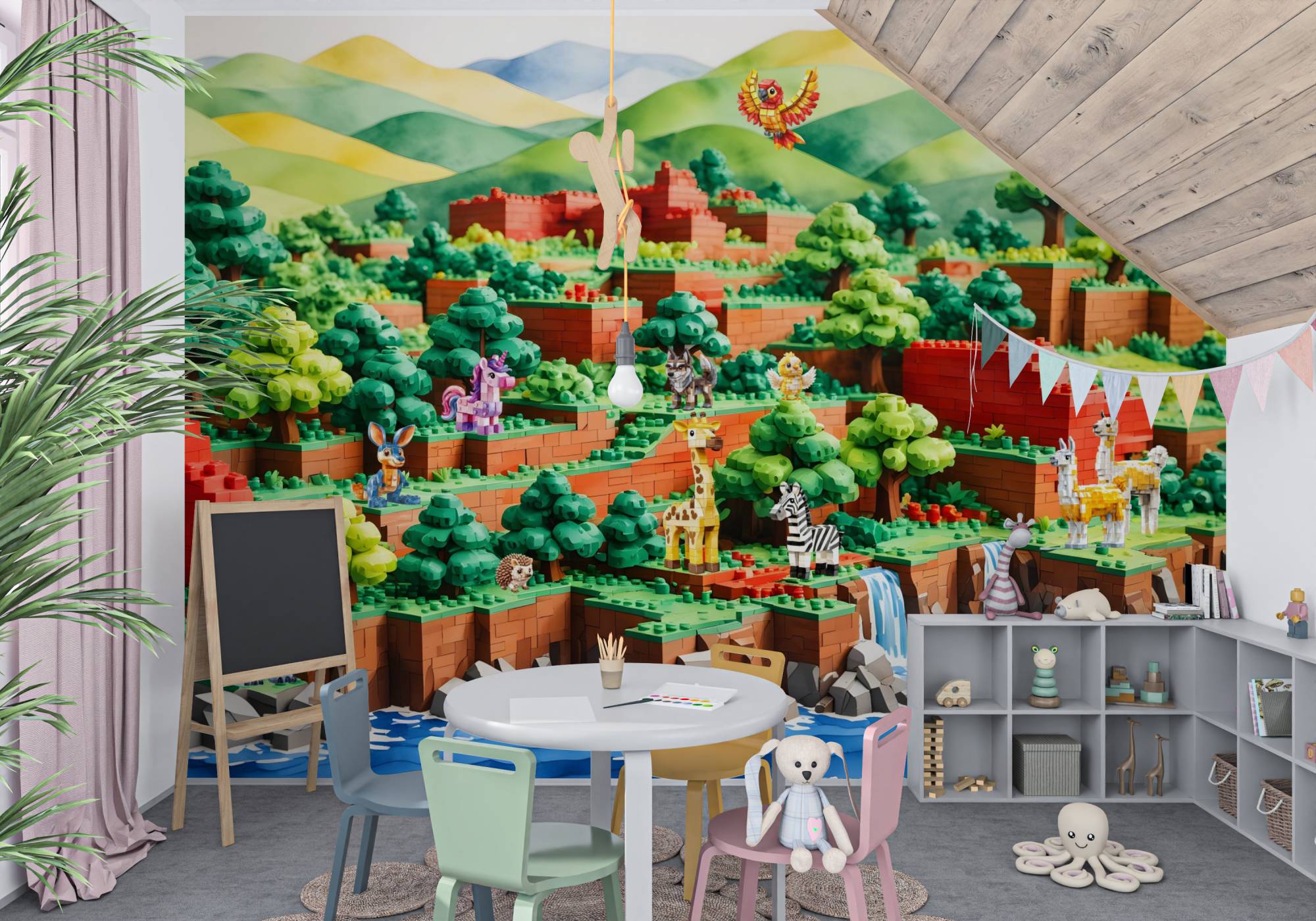 Odkryj fototapetę dla dzieci wyspa z klocków pełna zwierząt!  Twoje dziecko pokocha ten bajkowy świat dzikich zwierząt! Ta urocza tapeta dziecięca z wizerunkami przyjaznej żyrafy, słonia, zebry, lwiątka i nosorożca przeniesie malucha w tropikalną dżunglę. Idealna do pokoju dziecka, tworzy magiczną atmosferę i pobudza wyobraźnię. Wykonana z wysokiej jakości materiałów, łatwa w montażu.