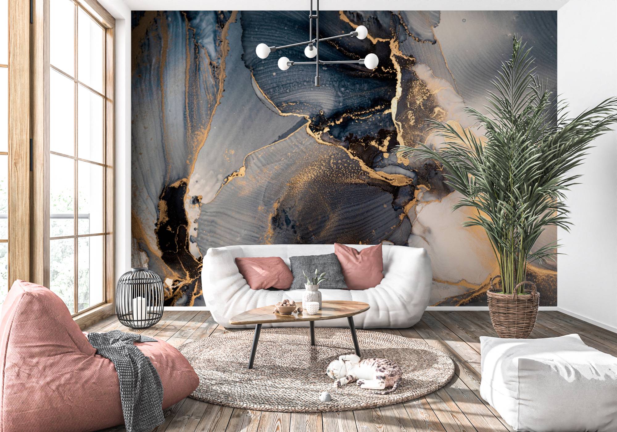 Wprowadź do swojego wnętrza odrobinę luksusu dzięki tej zachwycającej fototapecie inspirowanej techniką fluid art. Wzór przedstawia artystyczne połączenie głębokiego granatu, dymnej szarości i bieli, które są przeplecione szlachetnymi, złotymi liniami imitującymi pęknięcia szlachetnego kamienia.