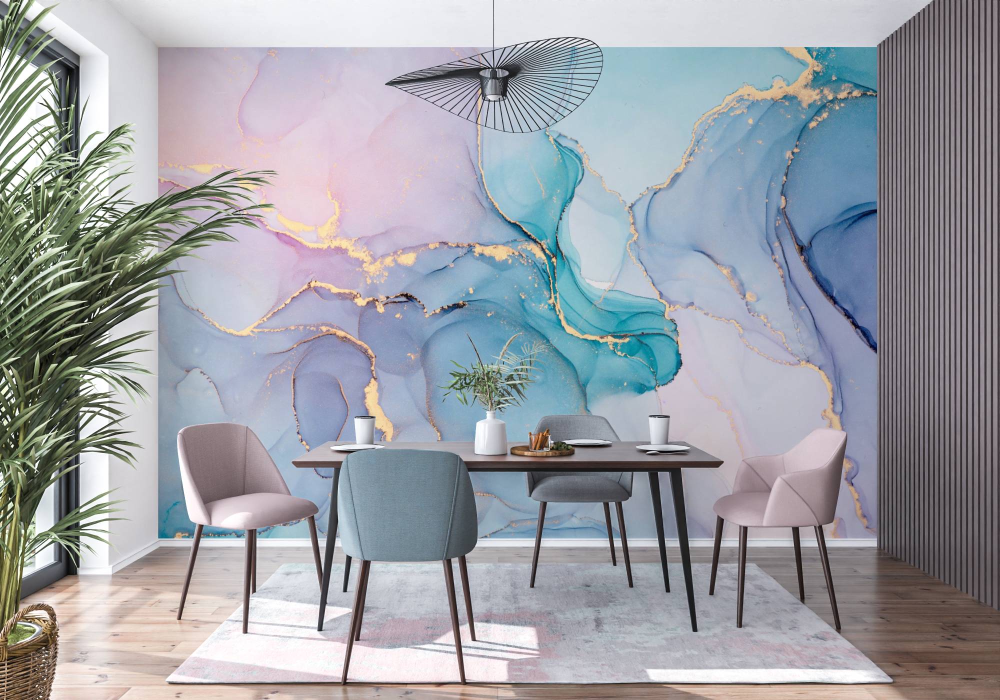 Wprowadź do swojego wnętrza odrobinę luksusu dzięki tej zachwycającej fototapecie inspirowanej techniką fluid art. Wzór przedstawia artystyczne połączenie pastelowych kolorów różu, niebieskiego i turkusu, które są przeplecione szlachetnymi, złotymi liniami imitującymi pęknięcia szlachetnego kamienia.