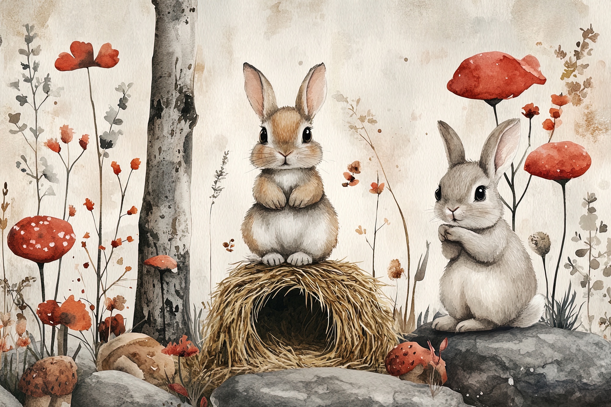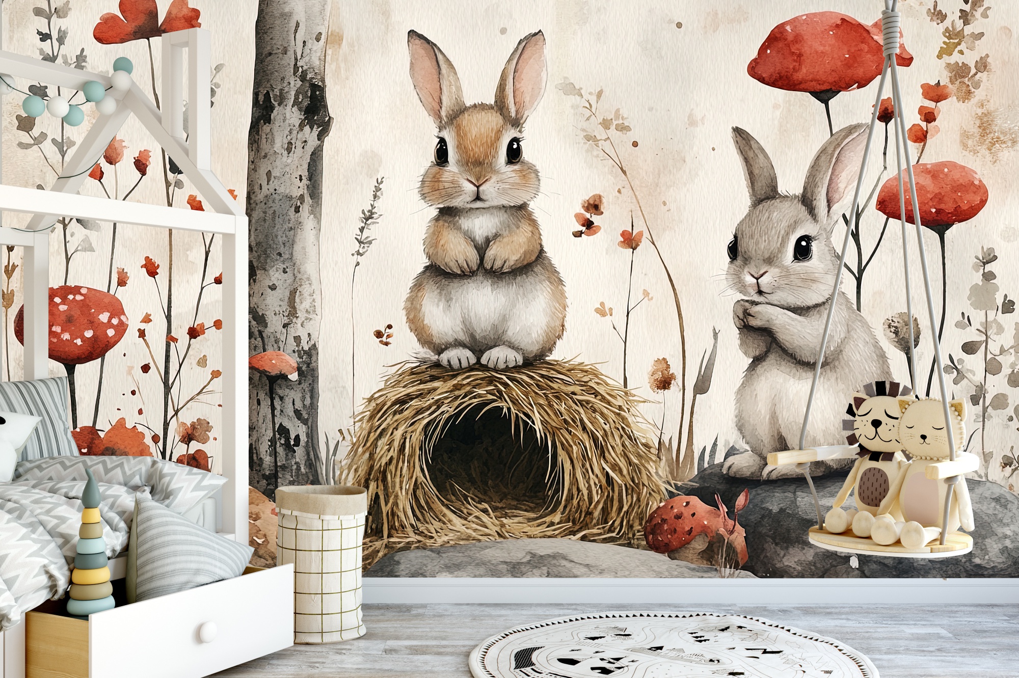 Tapeta dla dzieci urocze zajączki na leśnej polanie DWK544