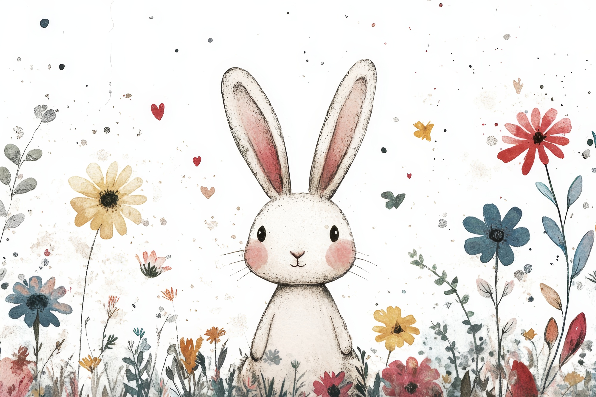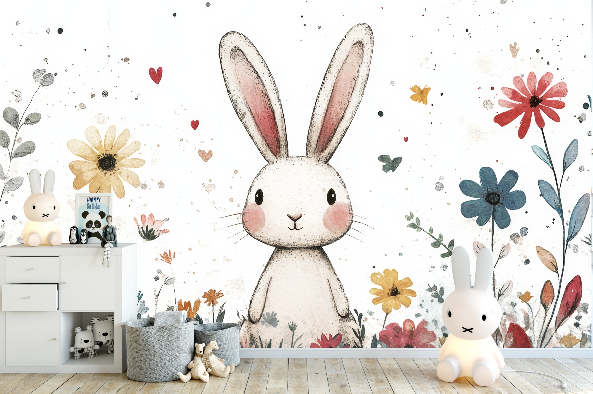 Tapeta dla dzieci malowany zajączek wśród kwiatów DWK522