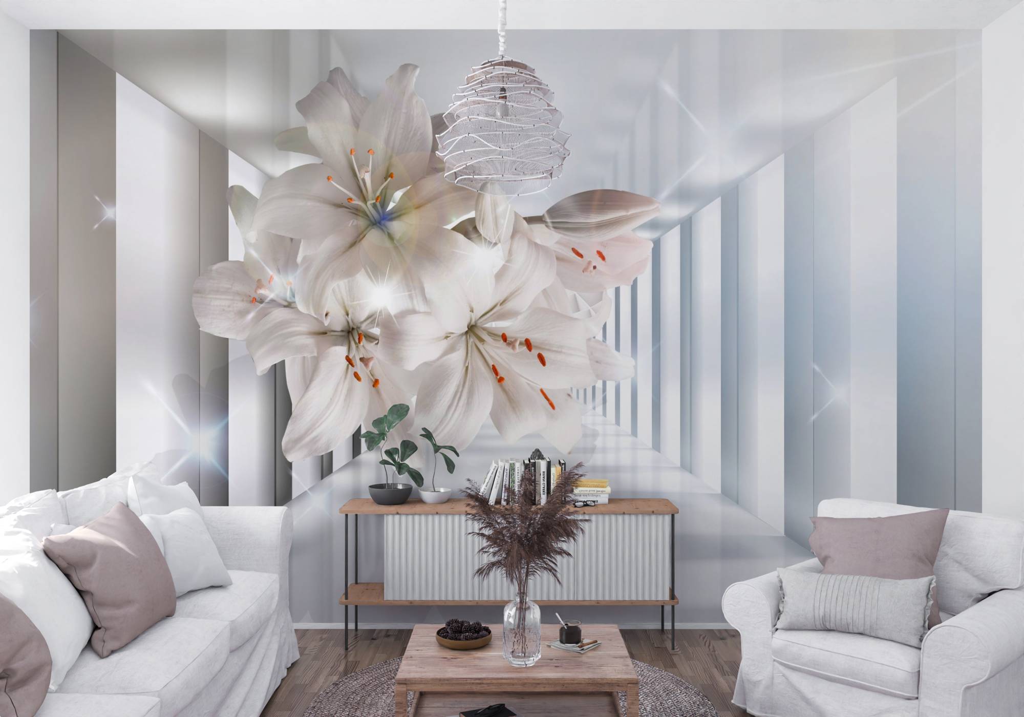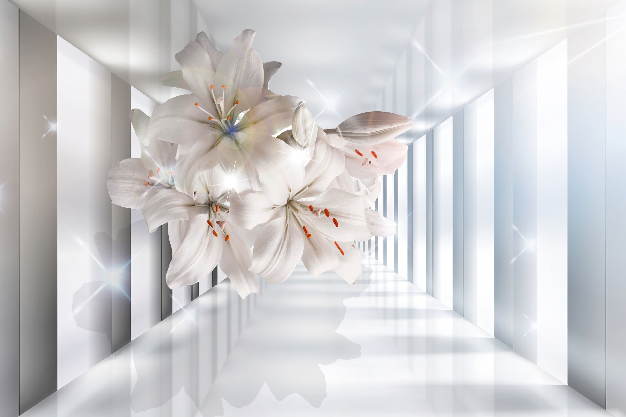 Tapeta do salonu 3D Białe Lilie w Nowoczesnym Tunelu