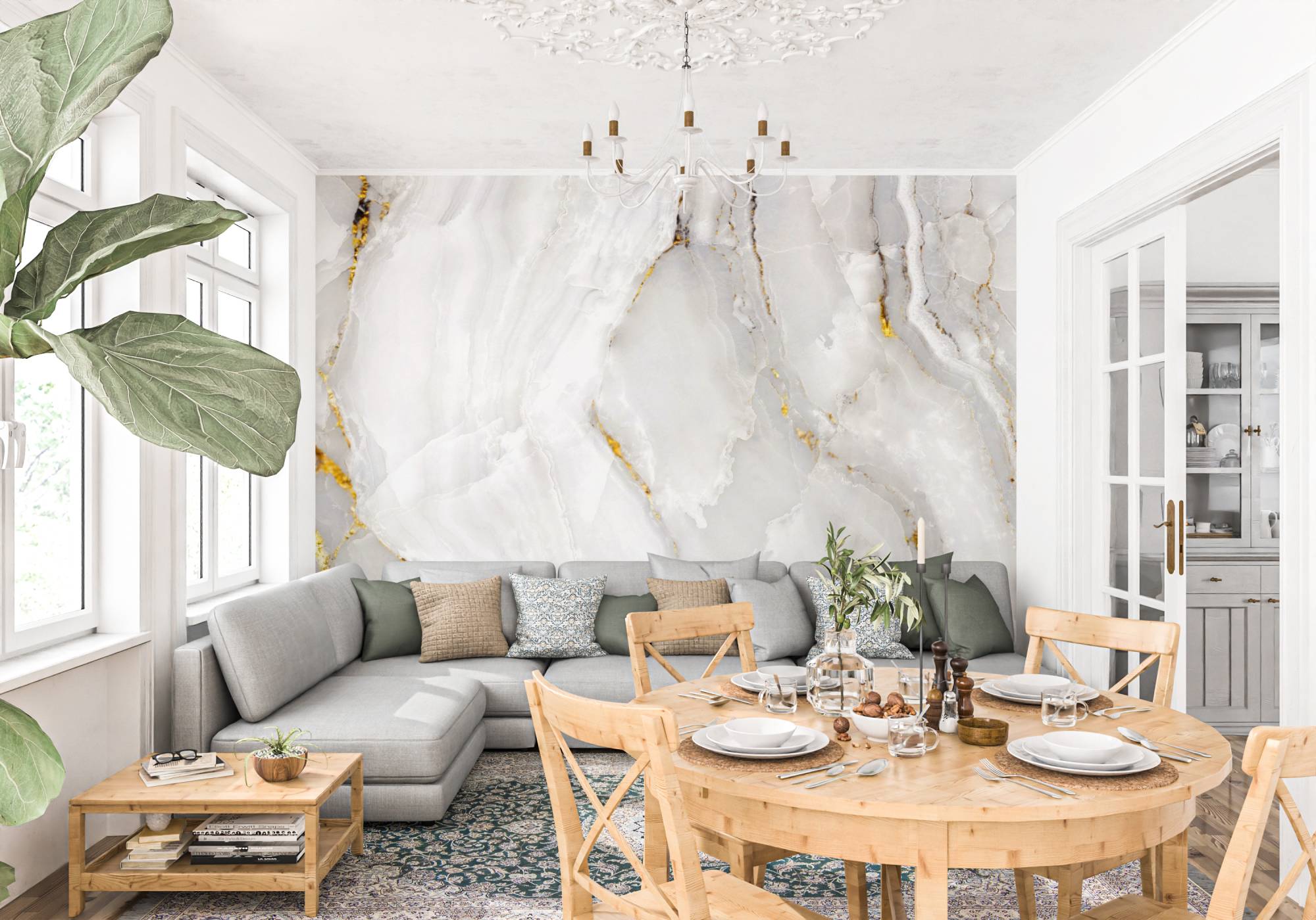 Wprowadź do swojego wnętrza odrobinę luksusu dzięki tapecie  Biały Marmur ze Złotymi Żyłkami