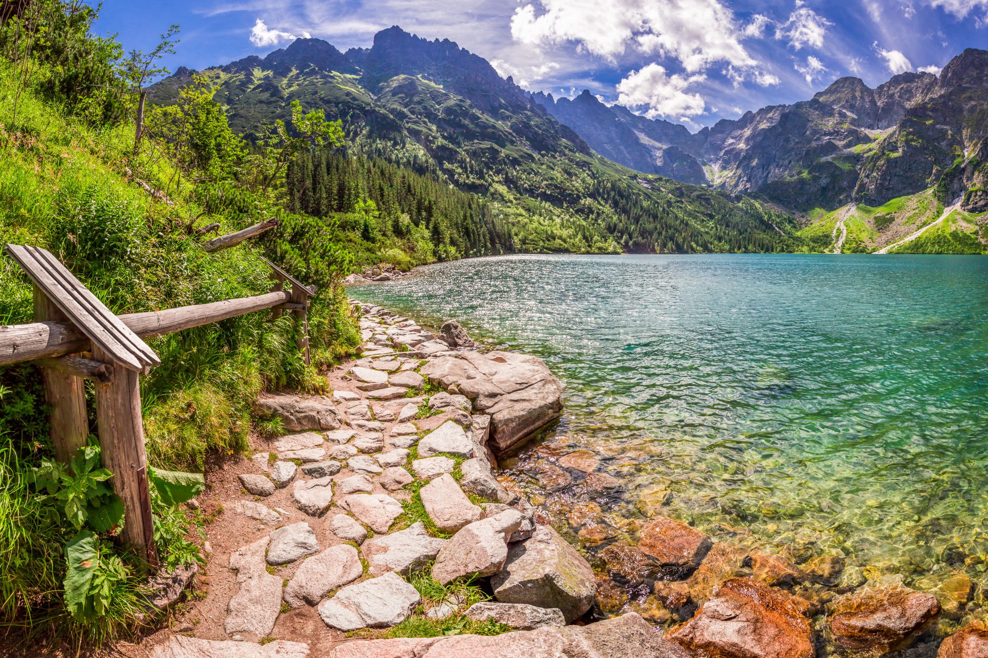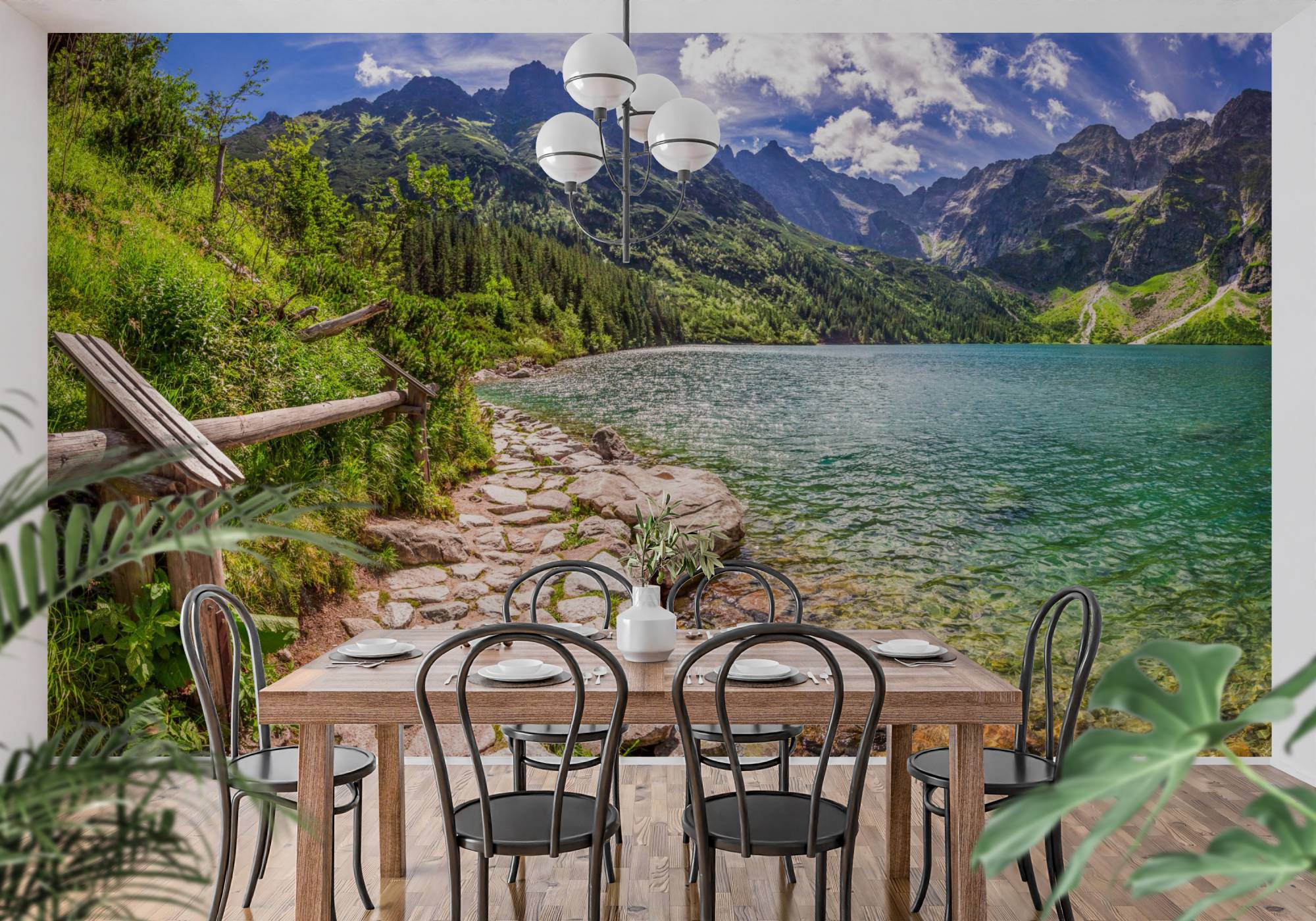 Ta tapeta przedstawia malownicze górskie jezioro z turkusową wodą, otoczone zielenią i majestatycznymi szczytami w tle. Drewniana ścieżka prowadząca wzdłuż brzegu dodaje realizmu i poczucia przestrzeni, dzięki czemu wnętrze staje się jaśniejsze i bardziej otwarte. To idealny wybór jeśli chcesz wprowadzić do pomieszczenia spokój, świeżość i naturalny klimat.  Pasuje do :
