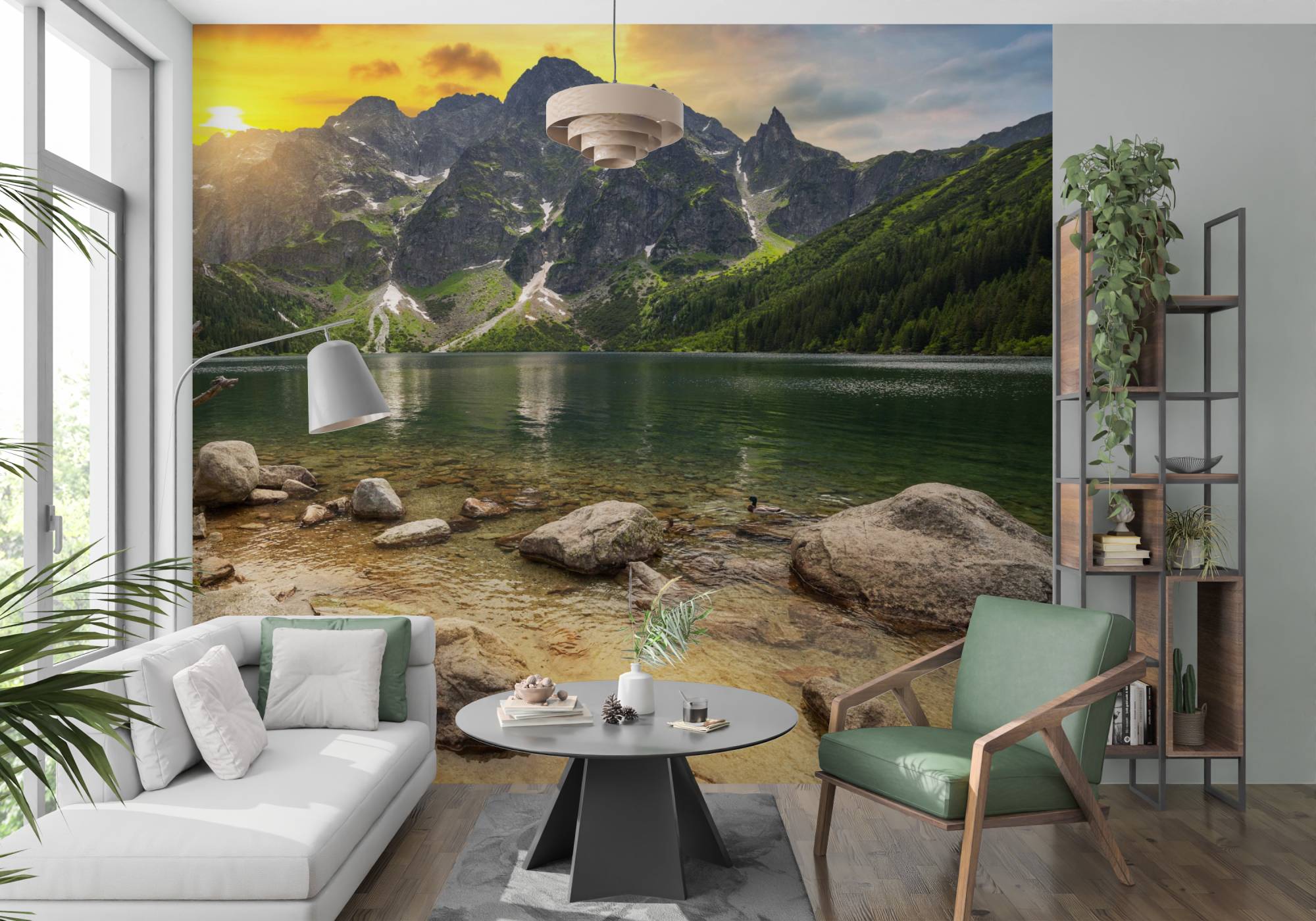 Tapeta do salonu jezioro w górach otoczone zielenią i majestatycznymi szczytami w tle i zachodzącym słońcem. Intensywna zieleń, błękit nieba oraz wyraźnie zarysowane kontury gór tworzą realistyczną, pełną energii scenerię, która otwiera wnętrze i nadaje mu nową głębię. To doskonały sposób, aby ocieplić przestrzeń i dodać jej nowoczesnego charakteru w naturalnym wydaniu.