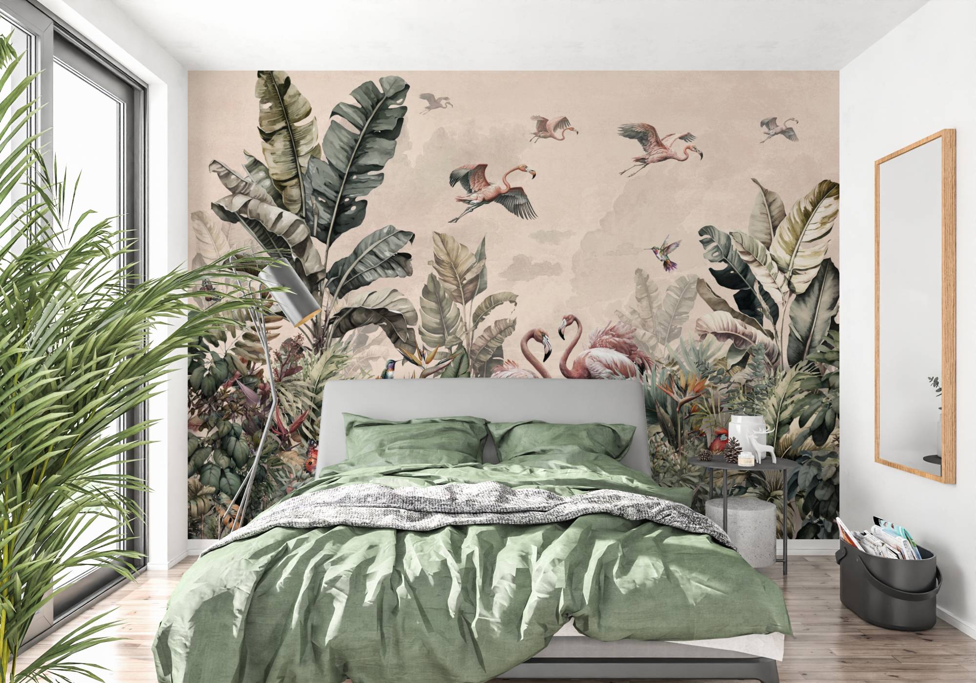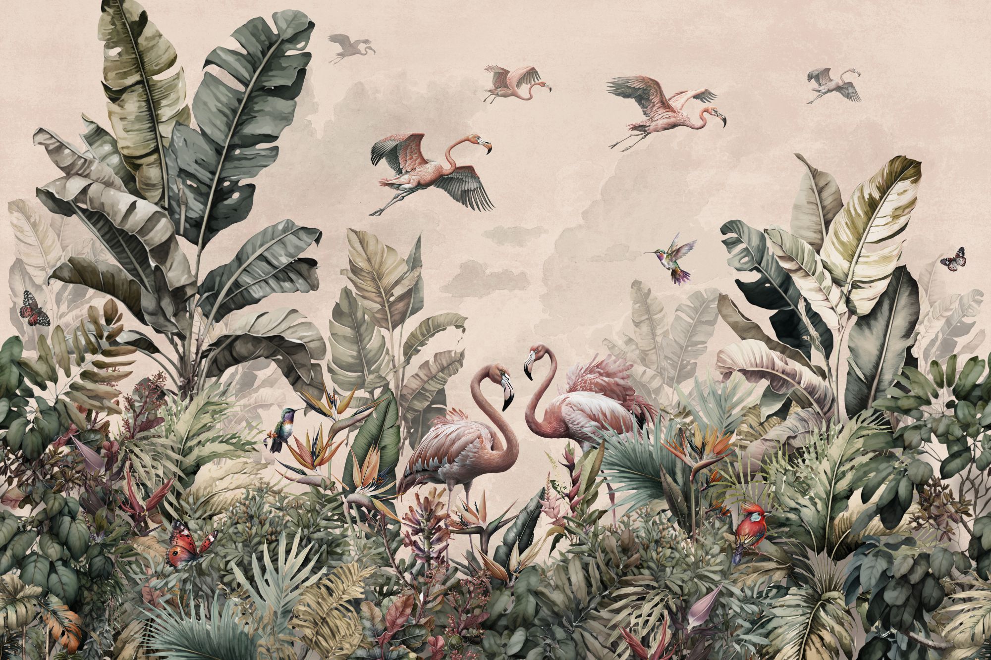 Tapeta Tropikalna Dżungla Vintage, Flamingi i Egzotyczne Ptaki